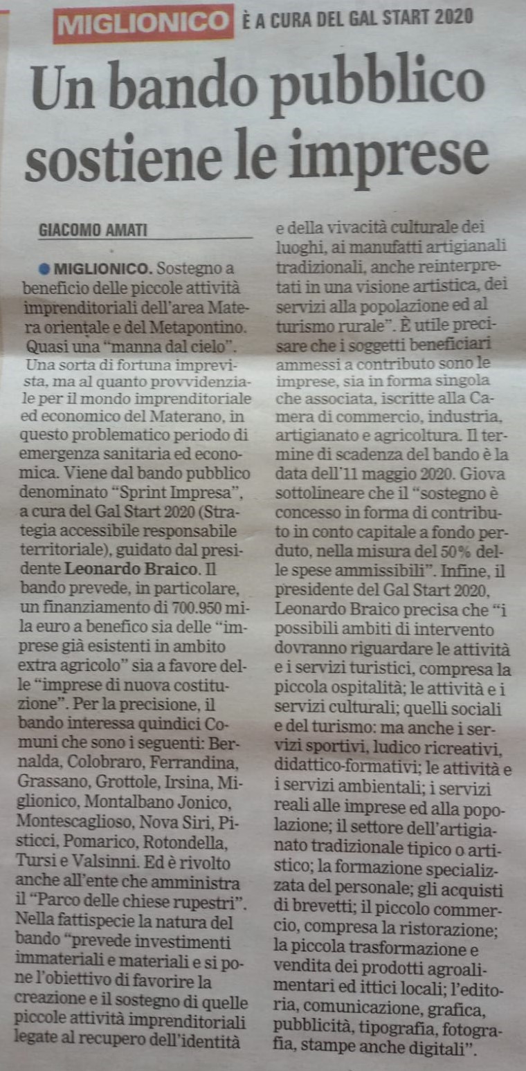 11Apr2020FacebookTwitter "Un Bando Pubblico sostiene le imprese"in Comunicati stampa, Notizie — estratto da Gazzetta del Mezzogiorno — a cura di Giacomo AMATI Download