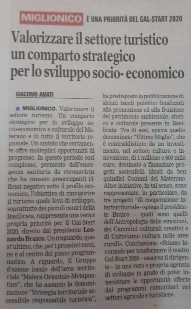 19Lug2020FacebookTwitter Valorizzare il settore turistico, un comparto strategico per lo sviluppo socio-economicoin Comunicati stampa, Notizie E’ UNA PRIORITA’ DEL GAL START2020 19 Luglio 2020 – www.lagazzettadelmezzogiorno.it a cura di Giacomo AMATI